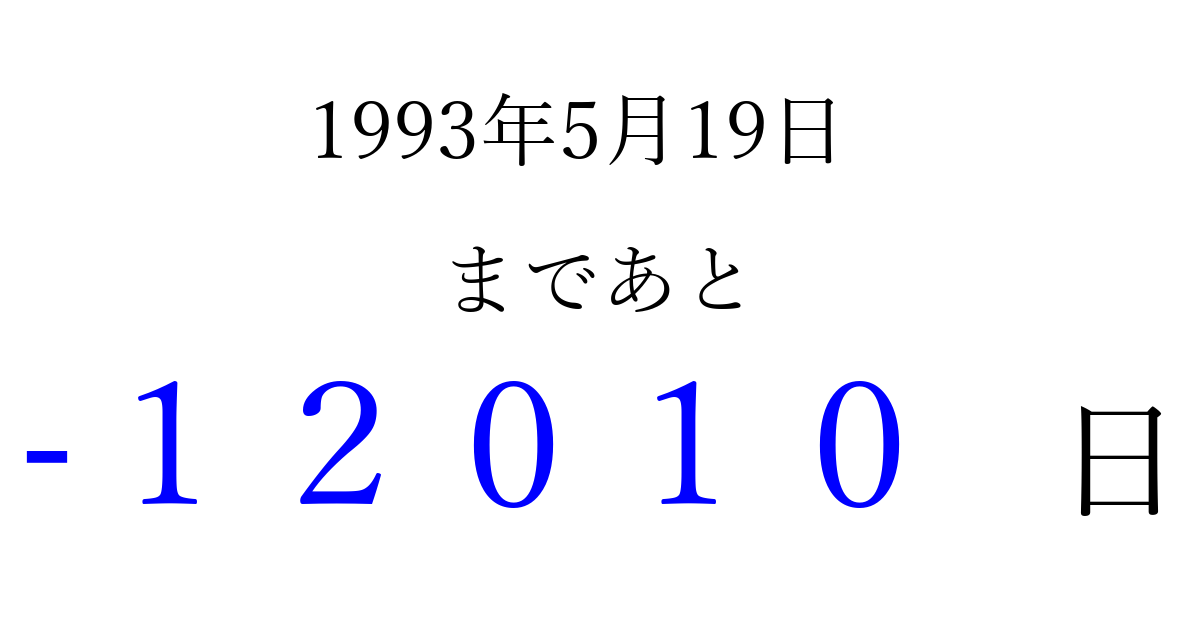 1993年5月19日(水)は もう 00000 日過ぎました 追加すると、トップページからすぐ選べるようになります ※2026/04/06現在の結果です。 最新の状態に更新する ↓シェアして、タイムライン上にカウントダウンを表示しよう!↓ 📤 この結果を共有する Tweet シェア Threads Bluesky 別の日付でカウントダウン 1993年5月のカレンダー このページをブックマークに追加すると、いつでもカウントダウンを確認できます。 (PC: Ctrl+D / Mac: ⌘+D) hitome-notes.comでは以下のページも運営しています。 指定日と期間から日付を計算 | ガチャ確率計算・シミュレーション | プライバシー・ポリシー 運営者:Avocado