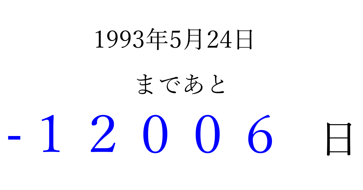 1993年5月24日(月)は もう 00000 日過ぎました 追加すると、トップページからすぐ選べるようになります ※2026/04/07現在の結果です。 最新の状態に更新する ↓シェアして、タイムライン上にカウントダウンを表示しよう!↓ 📤 この結果を共有する Tweet シェア Threads Bluesky 別の日付でカウントダウン 1993年5月のカレンダー このページをブックマークに追加すると、いつでもカウントダウンを確認できます。 (PC: Ctrl+D / Mac: ⌘+D) hitome-notes.comでは以下のページも運営しています。 指定日と期間から日付を計算 | ガチャ確率計算・シミュレーション | プライバシー・ポリシー 運営者:Avocado