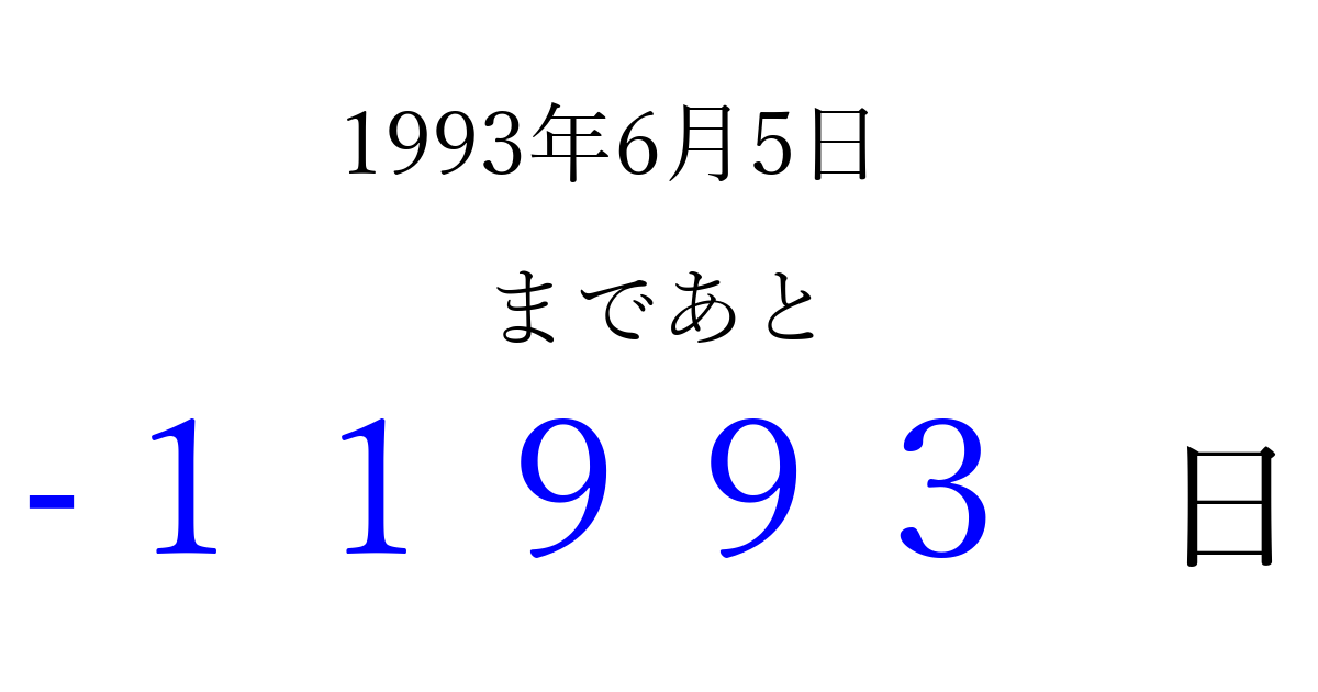 1993年6月5日(土)は もう 00000 日過ぎました 追加すると、トップページからすぐ選べるようになります ※2026/04/06現在の結果です。 最新の状態に更新する ↓シェアして、タイムライン上にカウントダウンを表示しよう!↓ 📤 この結果を共有する Tweet シェア Threads Bluesky 別の日付でカウントダウン 1993年6月のカレンダー このページをブックマークに追加すると、いつでもカウントダウンを確認できます。 (PC: Ctrl+D / Mac: ⌘+D) hitome-notes.comでは以下のページも運営しています。 指定日と期間から日付を計算 | ガチャ確率計算・シミュレーション | プライバシー・ポリシー 運営者:Avocado