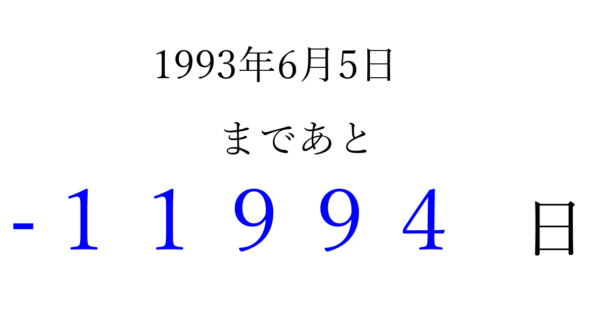 1993年6月5日(土)は もう 00000 日過ぎました 追加すると、トップページからすぐ選べるようになります ※2026/04/07現在の結果です。 最新の状態に更新する ↓シェアして、タイムライン上にカウントダウンを表示しよう!↓ 📤 この結果を共有する Tweet シェア Threads Bluesky 別の日付でカウントダウン 1993年6月のカレンダー このページをブックマークに追加すると、いつでもカウントダウンを確認できます。 (PC: Ctrl+D / Mac: ⌘+D) hitome-notes.comでは以下のページも運営しています。 指定日と期間から日付を計算 | ガチャ確率計算・シミュレーション | プライバシー・ポリシー 運営者:Avocado