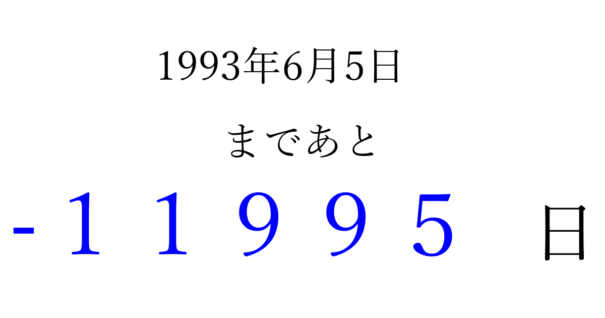 1993年6月5日(土)は もう 00000 日過ぎました 追加すると、トップページからすぐ選べるようになります ※2026/04/08現在の結果です。 最新の状態に更新する ↓シェアして、タイムライン上にカウントダウンを表示しよう!↓ 📤 この結果を共有する Tweet シェア Threads Bluesky 別の日付でカウントダウン 1993年6月のカレンダー このページをブックマークに追加すると、いつでもカウントダウンを確認できます。 (PC: Ctrl+D / Mac: ⌘+D) hitome-notes.comでは以下のページも運営しています。 指定日と期間から日付を計算 | ガチャ確率計算・シミュレーション | プライバシー・ポリシー 運営者:Avocado