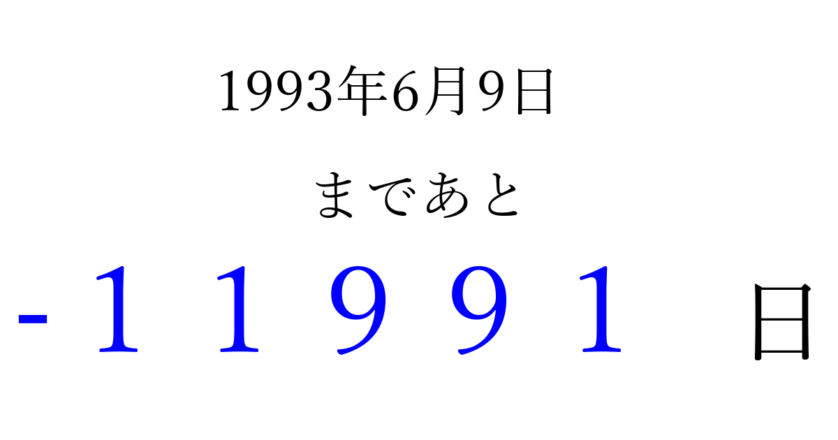 1993年6月9日(水)は もう 00000 日過ぎました 追加すると、トップページからすぐ選べるようになります ※2026/04/08現在の結果です。 最新の状態に更新する ↓シェアして、タイムライン上にカウントダウンを表示しよう!↓ 📤 この結果を共有する Tweet シェア Threads Bluesky 別の日付でカウントダウン 1993年6月のカレンダー このページをブックマークに追加すると、いつでもカウントダウンを確認できます。 (PC: Ctrl+D / Mac: ⌘+D) hitome-notes.comでは以下のページも運営しています。 指定日と期間から日付を計算 | ガチャ確率計算・シミュレーション | プライバシー・ポリシー 運営者:Avocado