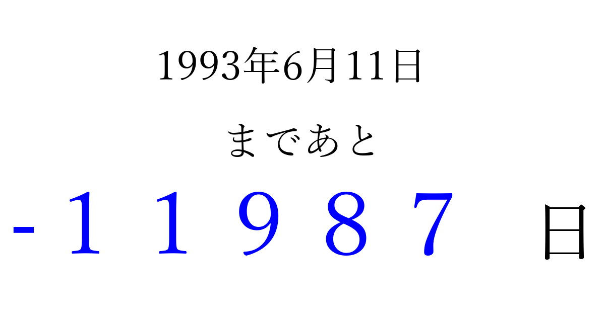 1993年6月11日(金)は もう 00000 日過ぎました 追加すると、トップページからすぐ選べるようになります ※2026/04/06現在の結果です。 最新の状態に更新する ↓シェアして、タイムライン上にカウントダウンを表示しよう!↓ 📤 この結果を共有する Tweet シェア Threads Bluesky 別の日付でカウントダウン 1993年6月のカレンダー このページをブックマークに追加すると、いつでもカウントダウンを確認できます。 (PC: Ctrl+D / Mac: ⌘+D) hitome-notes.comでは以下のページも運営しています。 指定日と期間から日付を計算 | ガチャ確率計算・シミュレーション | プライバシー・ポリシー 運営者:Avocado