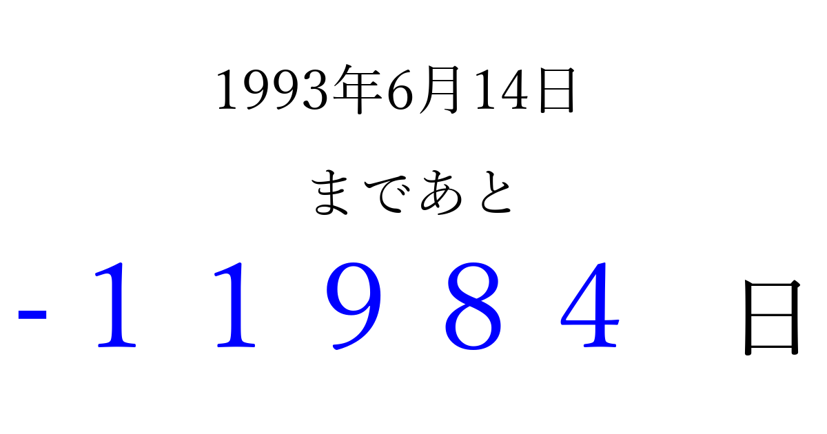 1993年6月14日(月)は もう 00000 日過ぎました 追加すると、トップページからすぐ選べるようになります ※2026/04/06現在の結果です。 最新の状態に更新する ↓シェアして、タイムライン上にカウントダウンを表示しよう!↓ 📤 この結果を共有する Tweet シェア Threads Bluesky 別の日付でカウントダウン 1993年6月のカレンダー このページをブックマークに追加すると、いつでもカウントダウンを確認できます。 (PC: Ctrl+D / Mac: ⌘+D) hitome-notes.comでは以下のページも運営しています。 指定日と期間から日付を計算 | ガチャ確率計算・シミュレーション | プライバシー・ポリシー 運営者:Avocado