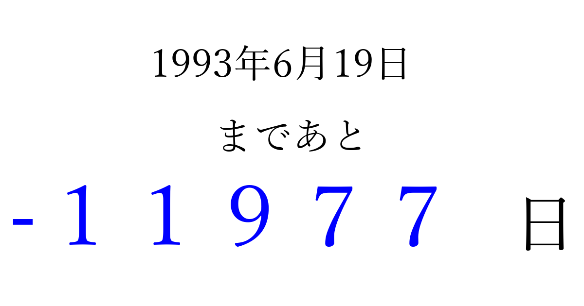 1993年6月19日(土)は もう 00000 日過ぎました 追加すると、トップページからすぐ選べるようになります ※2026/04/04現在の結果です。 最新の状態に更新する ↓シェアして、タイムライン上にカウントダウンを表示しよう!↓ 📤 この結果を共有する Tweet シェア Threads Bluesky 別の日付でカウントダウン 1993年6月のカレンダー このページをブックマークに追加すると、いつでもカウントダウンを確認できます。 (PC: Ctrl+D / Mac: ⌘+D) hitome-notes.comでは以下のページも運営しています。 指定日と期間から日付を計算 | ガチャ確率計算・シミュレーション | プライバシー・ポリシー 運営者:Avocado