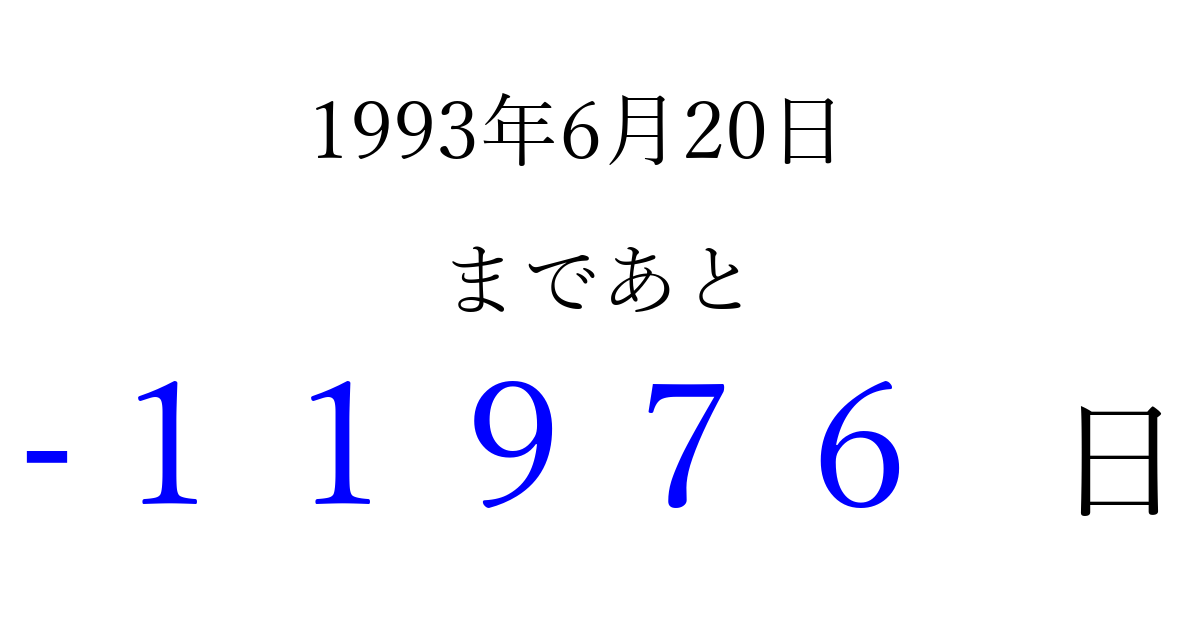 1993年6月20日(日)は もう 00000 日過ぎました 追加すると、トップページからすぐ選べるようになります ※2026/04/04現在の結果です。 最新の状態に更新する ↓シェアして、タイムライン上にカウントダウンを表示しよう!↓ 📤 この結果を共有する Tweet シェア Threads Bluesky 別の日付でカウントダウン 1993年6月のカレンダー このページをブックマークに追加すると、いつでもカウントダウンを確認できます。 (PC: Ctrl+D / Mac: ⌘+D) hitome-notes.comでは以下のページも運営しています。 指定日と期間から日付を計算 | ガチャ確率計算・シミュレーション | プライバシー・ポリシー 運営者:Avocado