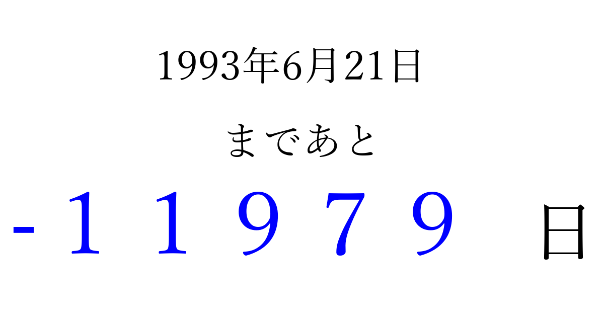 1993年6月21日(月)は もう 00000 日過ぎました 追加すると、トップページからすぐ選べるようになります ※2026/04/08現在の結果です。 最新の状態に更新する ↓シェアして、タイムライン上にカウントダウンを表示しよう!↓ 📤 この結果を共有する Tweet シェア Threads Bluesky 別の日付でカウントダウン 1993年6月のカレンダー このページをブックマークに追加すると、いつでもカウントダウンを確認できます。 (PC: Ctrl+D / Mac: ⌘+D) hitome-notes.comでは以下のページも運営しています。 指定日と期間から日付を計算 | ガチャ確率計算・シミュレーション | プライバシー・ポリシー 運営者:Avocado