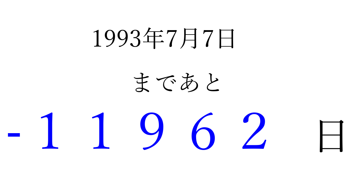 1993年7月7日(水)は もう 00000 日過ぎました 追加すると、トップページからすぐ選べるようになります ※2026/04/07現在の結果です。 最新の状態に更新する ↓シェアして、タイムライン上にカウントダウンを表示しよう!↓ 📤 この結果を共有する Tweet シェア Threads Bluesky 別の日付でカウントダウン 1993年7月のカレンダー このページをブックマークに追加すると、いつでもカウントダウンを確認できます。 (PC: Ctrl+D / Mac: ⌘+D) hitome-notes.comでは以下のページも運営しています。 指定日と期間から日付を計算 | ガチャ確率計算・シミュレーション | プライバシー・ポリシー 運営者:Avocado