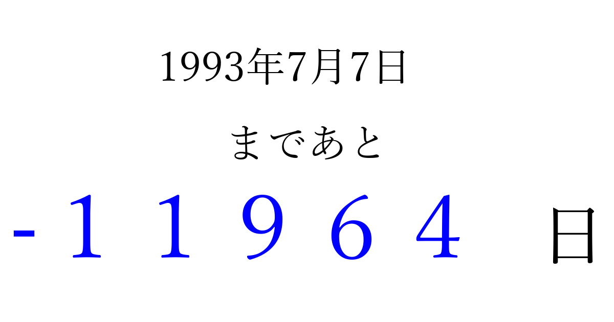 1993年7月7日(水)は もう 00000 日過ぎました 追加すると、トップページからすぐ選べるようになります ※2026/04/09現在の結果です。 最新の状態に更新する ↓シェアして、タイムライン上にカウントダウンを表示しよう!↓ 📤 この結果を共有する Tweet シェア Threads Bluesky 別の日付でカウントダウン 1993年7月のカレンダー このページをブックマークに追加すると、いつでもカウントダウンを確認できます。 (PC: Ctrl+D / Mac: ⌘+D) hitome-notes.comでは以下のページも運営しています。 指定日と期間から日付を計算 | ガチャ確率計算・シミュレーション | プライバシー・ポリシー 運営者:Avocado