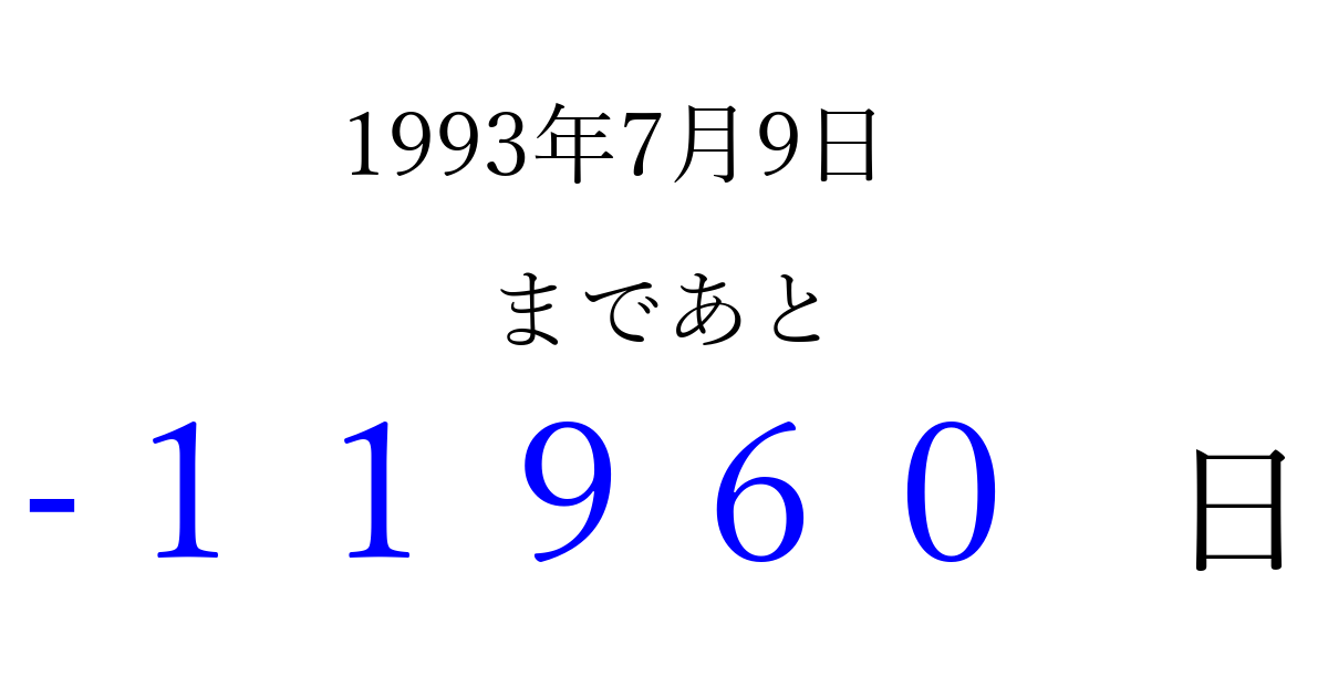 1993年7月9日(金)は もう 00000 日過ぎました 追加すると、トップページからすぐ選べるようになります ※2026/04/07現在の結果です。 最新の状態に更新する ↓シェアして、タイムライン上にカウントダウンを表示しよう!↓ 📤 この結果を共有する Tweet シェア Threads Bluesky 別の日付でカウントダウン 1993年7月のカレンダー このページをブックマークに追加すると、いつでもカウントダウンを確認できます。 (PC: Ctrl+D / Mac: ⌘+D) hitome-notes.comでは以下のページも運営しています。 指定日と期間から日付を計算 | ガチャ確率計算・シミュレーション | プライバシー・ポリシー 運営者:Avocado