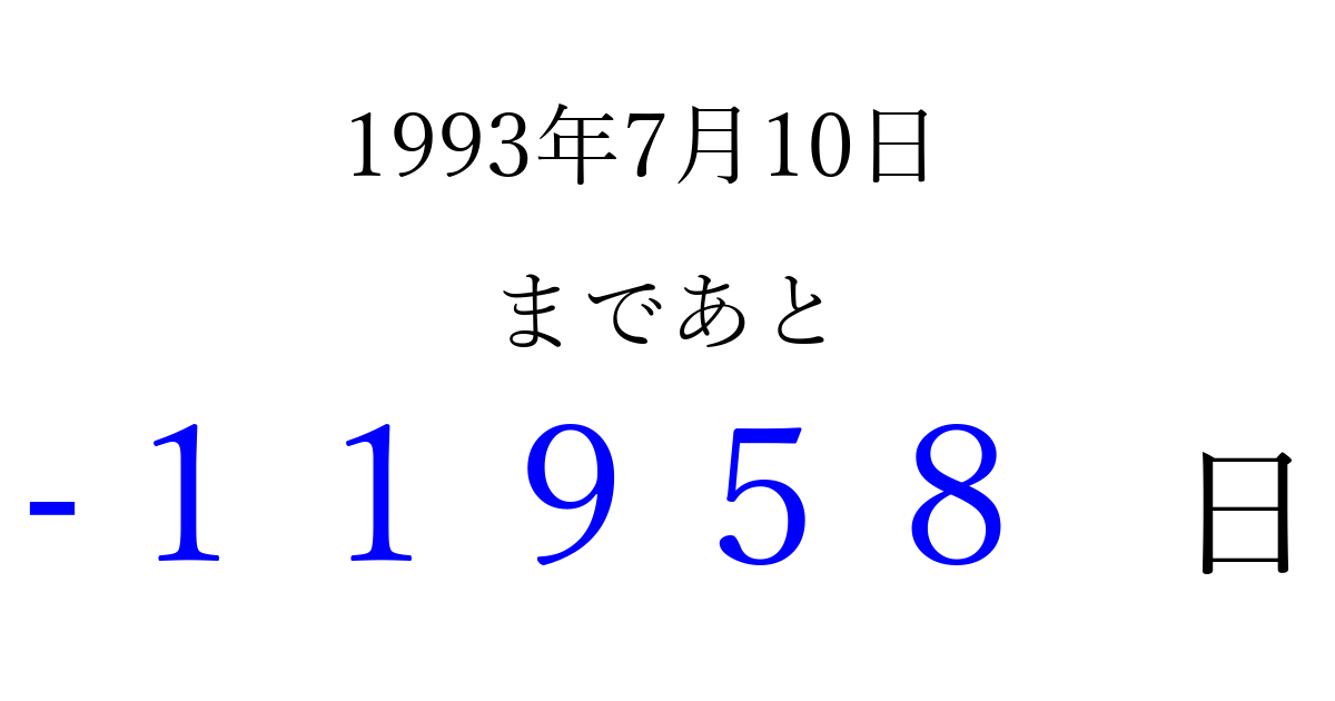1993年7月10日(土)は もう 00000 日過ぎました 追加すると、トップページからすぐ選べるようになります ※2026/04/06現在の結果です。 最新の状態に更新する ↓シェアして、タイムライン上にカウントダウンを表示しよう!↓ 📤 この結果を共有する Tweet シェア Threads Bluesky 別の日付でカウントダウン 1993年7月のカレンダー このページをブックマークに追加すると、いつでもカウントダウンを確認できます。 (PC: Ctrl+D / Mac: ⌘+D) hitome-notes.comでは以下のページも運営しています。 指定日と期間から日付を計算 | ガチャ確率計算・シミュレーション | プライバシー・ポリシー 運営者:Avocado