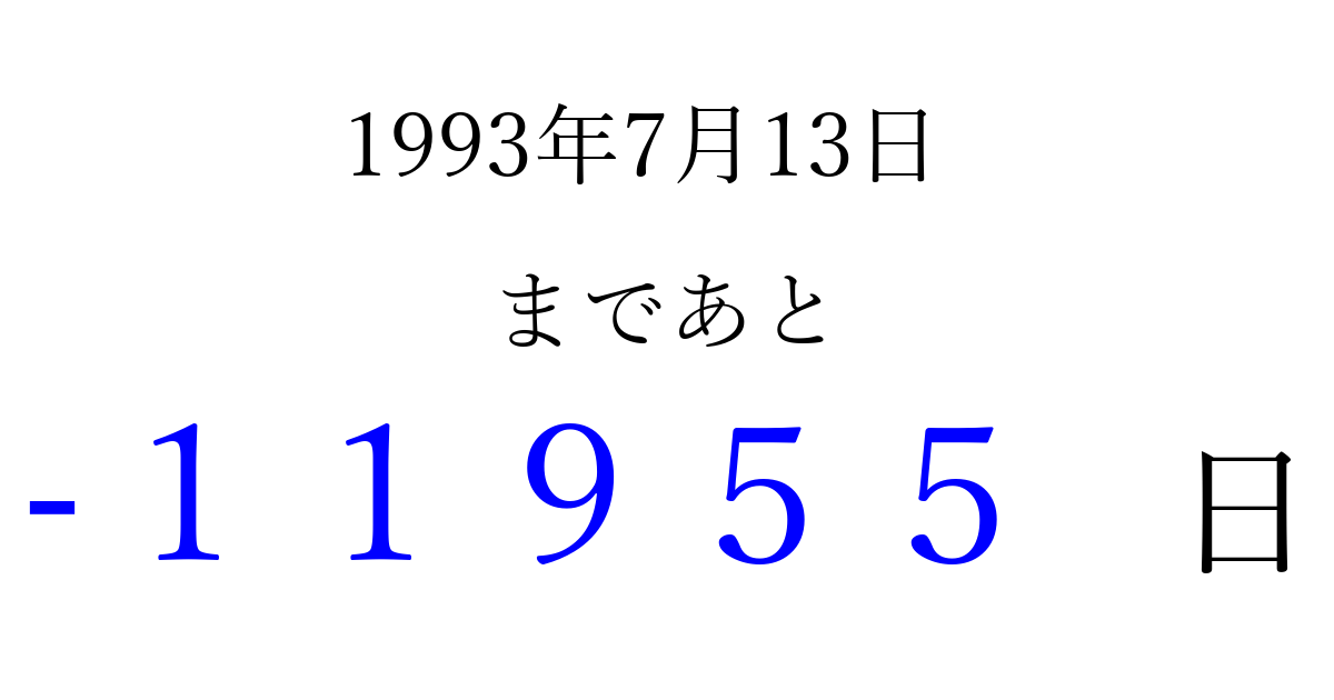 1993年7月13日(火)は もう 00000 日過ぎました 追加すると、トップページからすぐ選べるようになります ※2026/04/06現在の結果です。 最新の状態に更新する ↓シェアして、タイムライン上にカウントダウンを表示しよう!↓ 📤 この結果を共有する Tweet シェア Threads Bluesky 別の日付でカウントダウン 1993年7月のカレンダー このページをブックマークに追加すると、いつでもカウントダウンを確認できます。 (PC: Ctrl+D / Mac: ⌘+D) hitome-notes.comでは以下のページも運営しています。 指定日と期間から日付を計算 | ガチャ確率計算・シミュレーション | プライバシー・ポリシー 運営者:Avocado