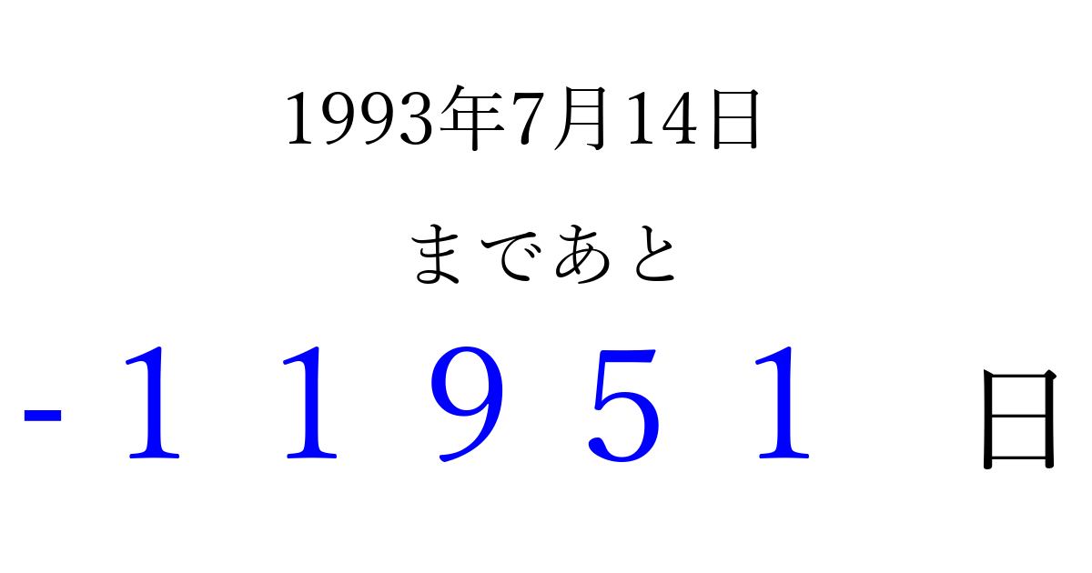 1993年7月14日(水)は もう 00000 日過ぎました 追加すると、トップページからすぐ選べるようになります ※2026/04/03現在の結果です。 最新の状態に更新する ↓シェアして、タイムライン上にカウントダウンを表示しよう!↓ 📤 この結果を共有する Tweet シェア Threads Bluesky 別の日付でカウントダウン 1993年7月のカレンダー このページをブックマークに追加すると、いつでもカウントダウンを確認できます。 (PC: Ctrl+D / Mac: ⌘+D) hitome-notes.comでは以下のページも運営しています。 指定日と期間から日付を計算 | ガチャ確率計算・シミュレーション | プライバシー・ポリシー 運営者:Avocado
