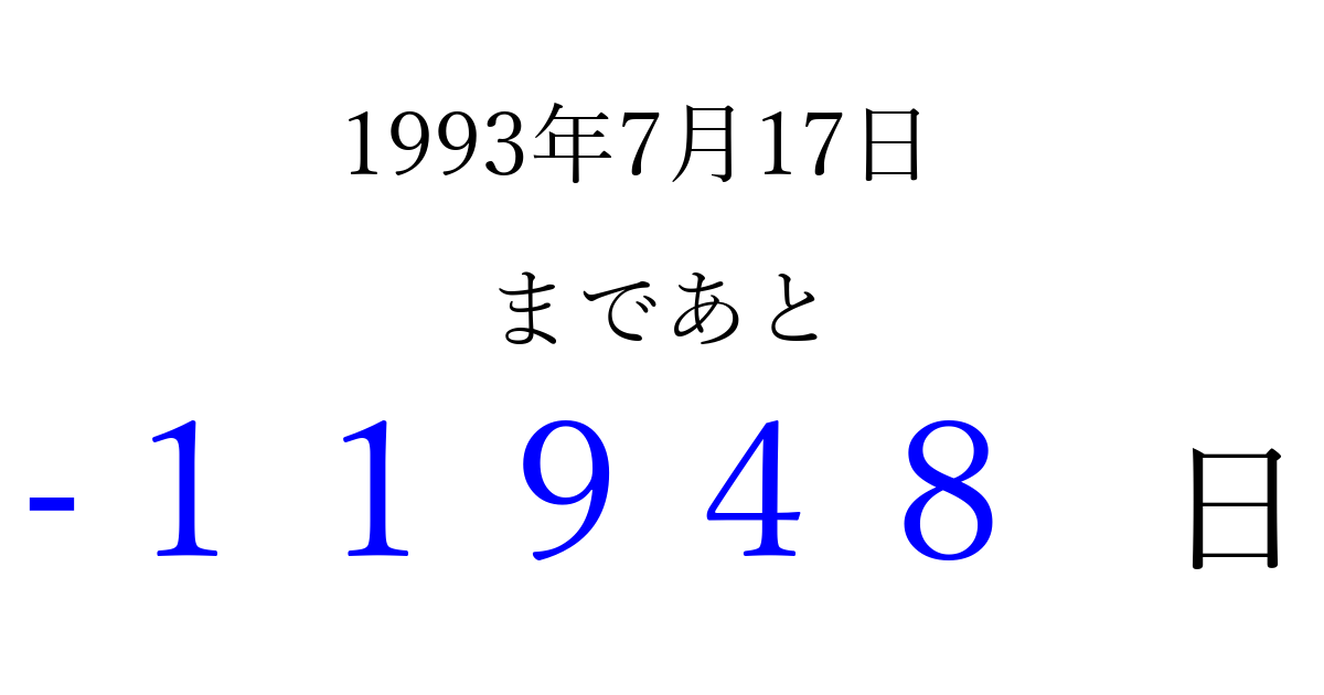 1993年7月17日(土)は もう 00000 日過ぎました 追加すると、トップページからすぐ選べるようになります ※2026/04/03現在の結果です。 最新の状態に更新する ↓シェアして、タイムライン上にカウントダウンを表示しよう!↓ 📤 この結果を共有する Tweet シェア Threads Bluesky 別の日付でカウントダウン 1993年7月のカレンダー このページをブックマークに追加すると、いつでもカウントダウンを確認できます。 (PC: Ctrl+D / Mac: ⌘+D) hitome-notes.comでは以下のページも運営しています。 指定日と期間から日付を計算 | ガチャ確率計算・シミュレーション | プライバシー・ポリシー 運営者:Avocado