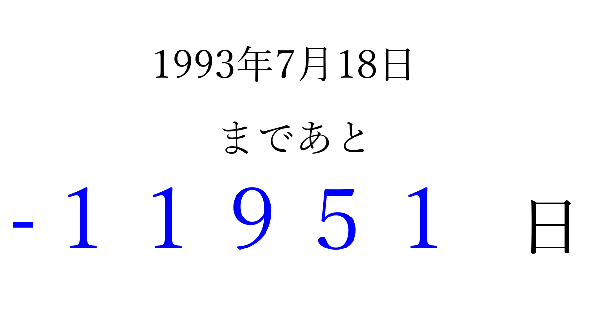 1993年7月18日(日)は もう 00000 日過ぎました 追加すると、トップページからすぐ選べるようになります ※2026/04/07現在の結果です。 最新の状態に更新する ↓シェアして、タイムライン上にカウントダウンを表示しよう!↓ 📤 この結果を共有する Tweet シェア Threads Bluesky 別の日付でカウントダウン 1993年7月のカレンダー このページをブックマークに追加すると、いつでもカウントダウンを確認できます。 (PC: Ctrl+D / Mac: ⌘+D) hitome-notes.comでは以下のページも運営しています。 指定日と期間から日付を計算 | ガチャ確率計算・シミュレーション | プライバシー・ポリシー 運営者:Avocado