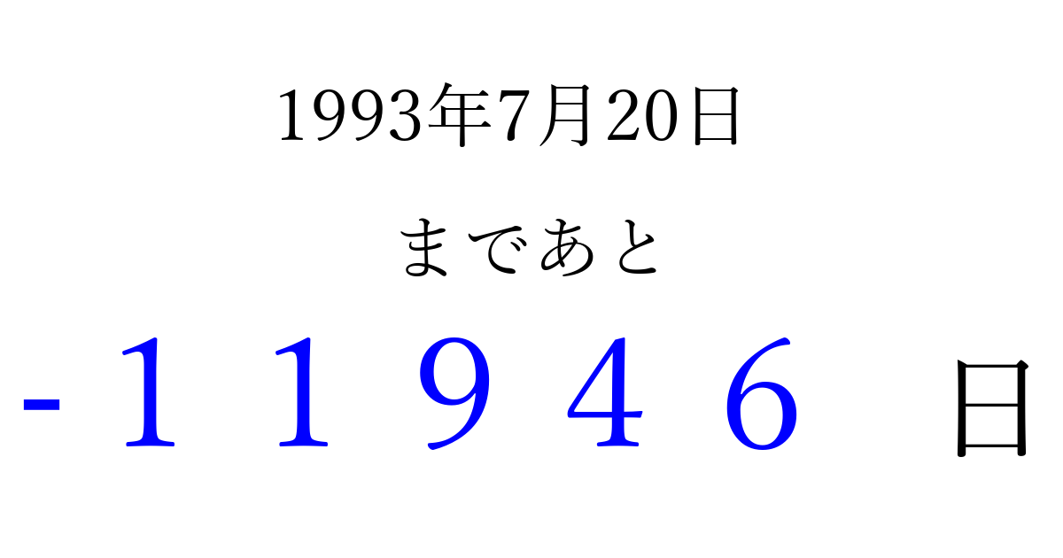 1993年7月20日(火)は もう 00000 日過ぎました 追加すると、トップページからすぐ選べるようになります ※2026/04/04現在の結果です。 最新の状態に更新する ↓シェアして、タイムライン上にカウントダウンを表示しよう!↓ 📤 この結果を共有する Tweet シェア Threads Bluesky 別の日付でカウントダウン 1993年7月のカレンダー このページをブックマークに追加すると、いつでもカウントダウンを確認できます。 (PC: Ctrl+D / Mac: ⌘+D) hitome-notes.comでは以下のページも運営しています。 指定日と期間から日付を計算 | ガチャ確率計算・シミュレーション | プライバシー・ポリシー 運営者:Avocado