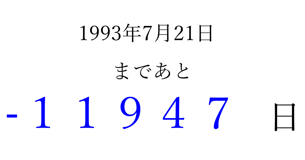 1993年7月21日(水)は もう 00000 日過ぎました 追加すると、トップページからすぐ選べるようになります ※2026/04/06現在の結果です。 最新の状態に更新する ↓シェアして、タイムライン上にカウントダウンを表示しよう!↓ 📤 この結果を共有する Tweet シェア Threads Bluesky 別の日付でカウントダウン 1993年7月のカレンダー このページをブックマークに追加すると、いつでもカウントダウンを確認できます。 (PC: Ctrl+D / Mac: ⌘+D) hitome-notes.comでは以下のページも運営しています。 指定日と期間から日付を計算 | ガチャ確率計算・シミュレーション | プライバシー・ポリシー 運営者:Avocado
