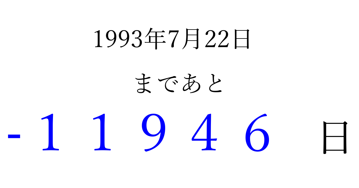 1993年7月22日(木)は もう 00000 日過ぎました 追加すると、トップページからすぐ選べるようになります ※2026/04/06現在の結果です。 最新の状態に更新する ↓シェアして、タイムライン上にカウントダウンを表示しよう!↓ 📤 この結果を共有する Tweet シェア Threads Bluesky 別の日付でカウントダウン 1993年7月のカレンダー このページをブックマークに追加すると、いつでもカウントダウンを確認できます。 (PC: Ctrl+D / Mac: ⌘+D) hitome-notes.comでは以下のページも運営しています。 指定日と期間から日付を計算 | ガチャ確率計算・シミュレーション | プライバシー・ポリシー 運営者:Avocado