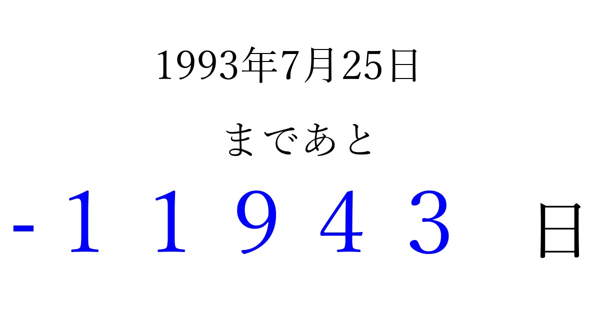 1993年7月25日(日)は もう 00000 日過ぎました 追加すると、トップページからすぐ選べるようになります ※2026/04/06現在の結果です。 最新の状態に更新する ↓シェアして、タイムライン上にカウントダウンを表示しよう!↓ 📤 この結果を共有する Tweet シェア Threads Bluesky 別の日付でカウントダウン 1993年7月のカレンダー このページをブックマークに追加すると、いつでもカウントダウンを確認できます。 (PC: Ctrl+D / Mac: ⌘+D) hitome-notes.comでは以下のページも運営しています。 指定日と期間から日付を計算 | ガチャ確率計算・シミュレーション | プライバシー・ポリシー 運営者:Avocado