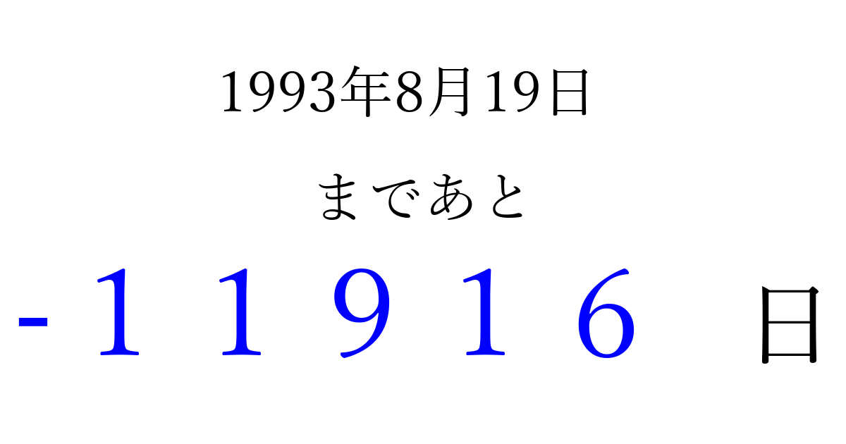 1993年8月19日(木)は もう 00000 日過ぎました 追加すると、トップページからすぐ選べるようになります ※2026/04/04現在の結果です。 最新の状態に更新する ↓シェアして、タイムライン上にカウントダウンを表示しよう!↓ 📤 この結果を共有する Tweet シェア Threads Bluesky 別の日付でカウントダウン 1993年8月のカレンダー このページをブックマークに追加すると、いつでもカウントダウンを確認できます。 (PC: Ctrl+D / Mac: ⌘+D) hitome-notes.comでは以下のページも運営しています。 指定日と期間から日付を計算 | ガチャ確率計算・シミュレーション | プライバシー・ポリシー 運営者:Avocado