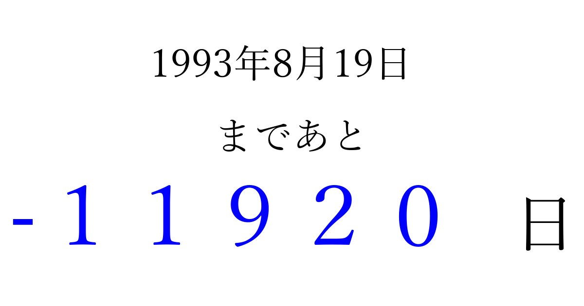 1993年8月19日(木)は もう 00000 日過ぎました 追加すると、トップページからすぐ選べるようになります ※2026/04/08現在の結果です。 最新の状態に更新する ↓シェアして、タイムライン上にカウントダウンを表示しよう!↓ 📤 この結果を共有する Tweet シェア Threads Bluesky 別の日付でカウントダウン 1993年8月のカレンダー このページをブックマークに追加すると、いつでもカウントダウンを確認できます。 (PC: Ctrl+D / Mac: ⌘+D) hitome-notes.comでは以下のページも運営しています。 指定日と期間から日付を計算 | ガチャ確率計算・シミュレーション | プライバシー・ポリシー 運営者:Avocado