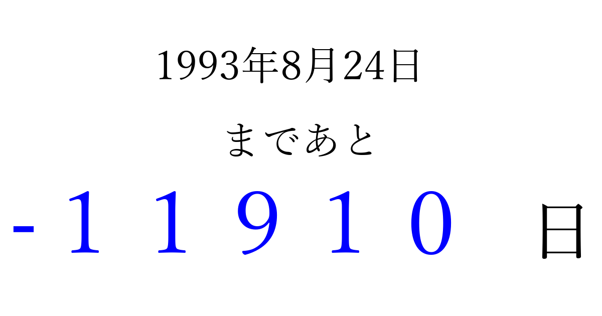 1993年8月24日(火)は もう 00000 日過ぎました 追加すると、トップページからすぐ選べるようになります ※2026/04/03現在の結果です。 最新の状態に更新する ↓シェアして、タイムライン上にカウントダウンを表示しよう!↓ 📤 この結果を共有する Tweet シェア Threads Bluesky 別の日付でカウントダウン 1993年8月のカレンダー このページをブックマークに追加すると、いつでもカウントダウンを確認できます。 (PC: Ctrl+D / Mac: ⌘+D) hitome-notes.comでは以下のページも運営しています。 指定日と期間から日付を計算 | ガチャ確率計算・シミュレーション | プライバシー・ポリシー 運営者:Avocado