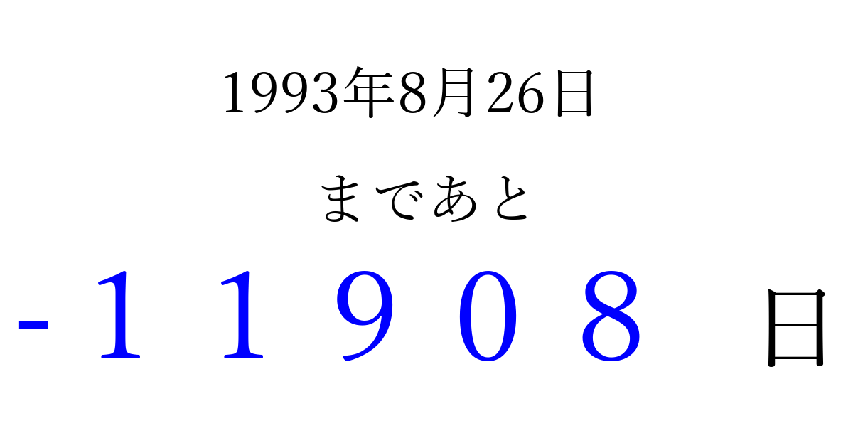 1993年8月26日(木)は もう 00000 日過ぎました 追加すると、トップページからすぐ選べるようになります ※2026/04/03現在の結果です。 最新の状態に更新する ↓シェアして、タイムライン上にカウントダウンを表示しよう!↓ 📤 この結果を共有する Tweet シェア Threads Bluesky 別の日付でカウントダウン 1993年8月のカレンダー このページをブックマークに追加すると、いつでもカウントダウンを確認できます。 (PC: Ctrl+D / Mac: ⌘+D) hitome-notes.comでは以下のページも運営しています。 指定日と期間から日付を計算 | ガチャ確率計算・シミュレーション | プライバシー・ポリシー 運営者:Avocado
