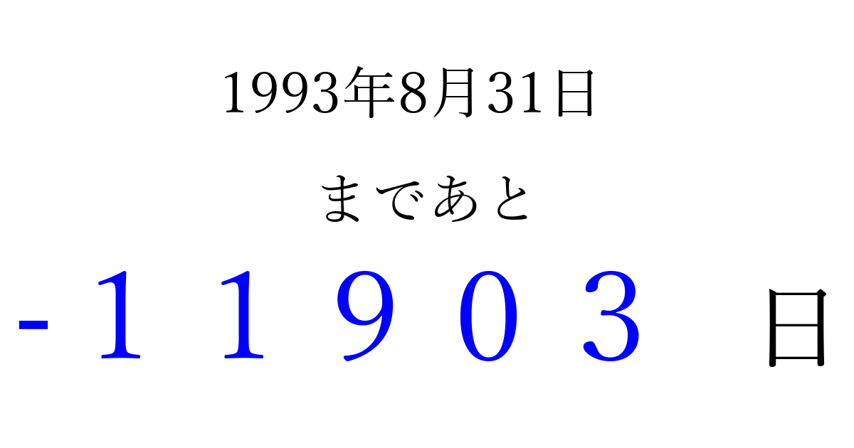 1993年8月31日(火)は もう 00000 日過ぎました 追加すると、トップページからすぐ選べるようになります ※2026/04/03現在の結果です。 最新の状態に更新する ↓シェアして、タイムライン上にカウントダウンを表示しよう!↓ 📤 この結果を共有する Tweet シェア Threads Bluesky 別の日付でカウントダウン 1993年8月のカレンダー このページをブックマークに追加すると、いつでもカウントダウンを確認できます。 (PC: Ctrl+D / Mac: ⌘+D) hitome-notes.comでは以下のページも運営しています。 指定日と期間から日付を計算 | ガチャ確率計算・シミュレーション | プライバシー・ポリシー 運営者:Avocado