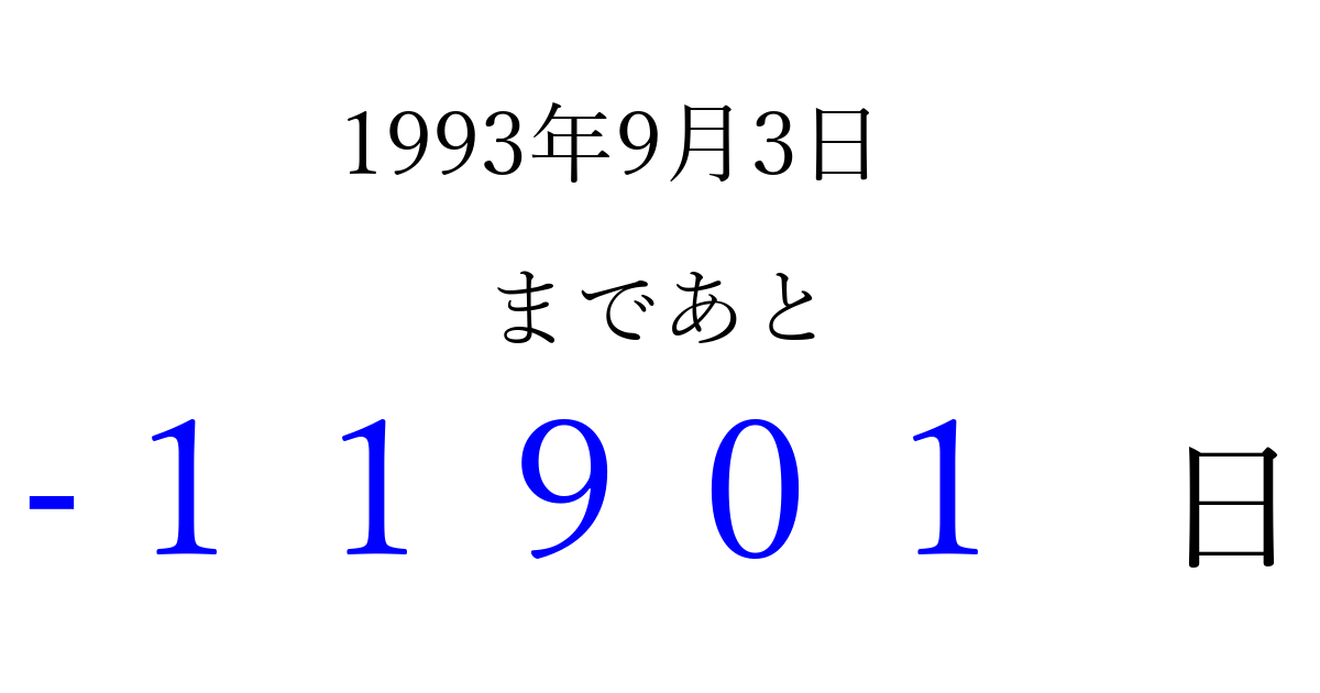1993年9月3日(金)は もう 00000 日過ぎました 追加すると、トップページからすぐ選べるようになります ※2026/04/04現在の結果です。 最新の状態に更新する ↓シェアして、タイムライン上にカウントダウンを表示しよう!↓ 📤 この結果を共有する Tweet シェア Threads Bluesky 別の日付でカウントダウン 1993年9月のカレンダー このページをブックマークに追加すると、いつでもカウントダウンを確認できます。 (PC: Ctrl+D / Mac: ⌘+D) hitome-notes.comでは以下のページも運営しています。 指定日と期間から日付を計算 | ガチャ確率計算・シミュレーション | プライバシー・ポリシー 運営者:Avocado
