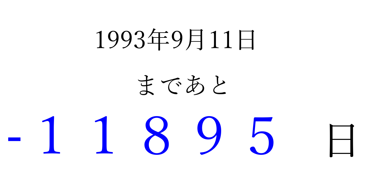 1993年9月11日(土)は もう 00000 日過ぎました 追加すると、トップページからすぐ選べるようになります ※2026/04/06現在の結果です。 最新の状態に更新する ↓シェアして、タイムライン上にカウントダウンを表示しよう!↓ 📤 この結果を共有する Tweet シェア Threads Bluesky 別の日付でカウントダウン 1993年9月のカレンダー このページをブックマークに追加すると、いつでもカウントダウンを確認できます。 (PC: Ctrl+D / Mac: ⌘+D) hitome-notes.comでは以下のページも運営しています。 指定日と期間から日付を計算 | ガチャ確率計算・シミュレーション | プライバシー・ポリシー 運営者:Avocado