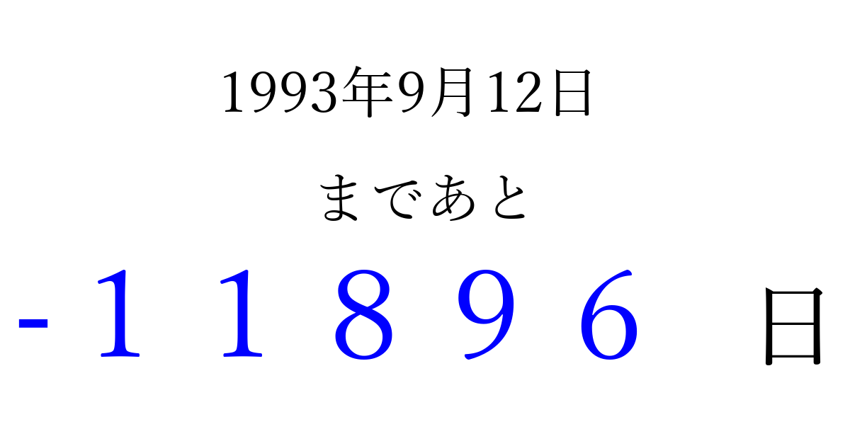 1993年9月12日(日)は もう 00000 日過ぎました 追加すると、トップページからすぐ選べるようになります ※2026/04/08現在の結果です。 最新の状態に更新する ↓シェアして、タイムライン上にカウントダウンを表示しよう!↓ 📤 この結果を共有する Tweet シェア Threads Bluesky 別の日付でカウントダウン 1993年9月のカレンダー このページをブックマークに追加すると、いつでもカウントダウンを確認できます。 (PC: Ctrl+D / Mac: ⌘+D) hitome-notes.comでは以下のページも運営しています。 指定日と期間から日付を計算 | ガチャ確率計算・シミュレーション | プライバシー・ポリシー 運営者:Avocado