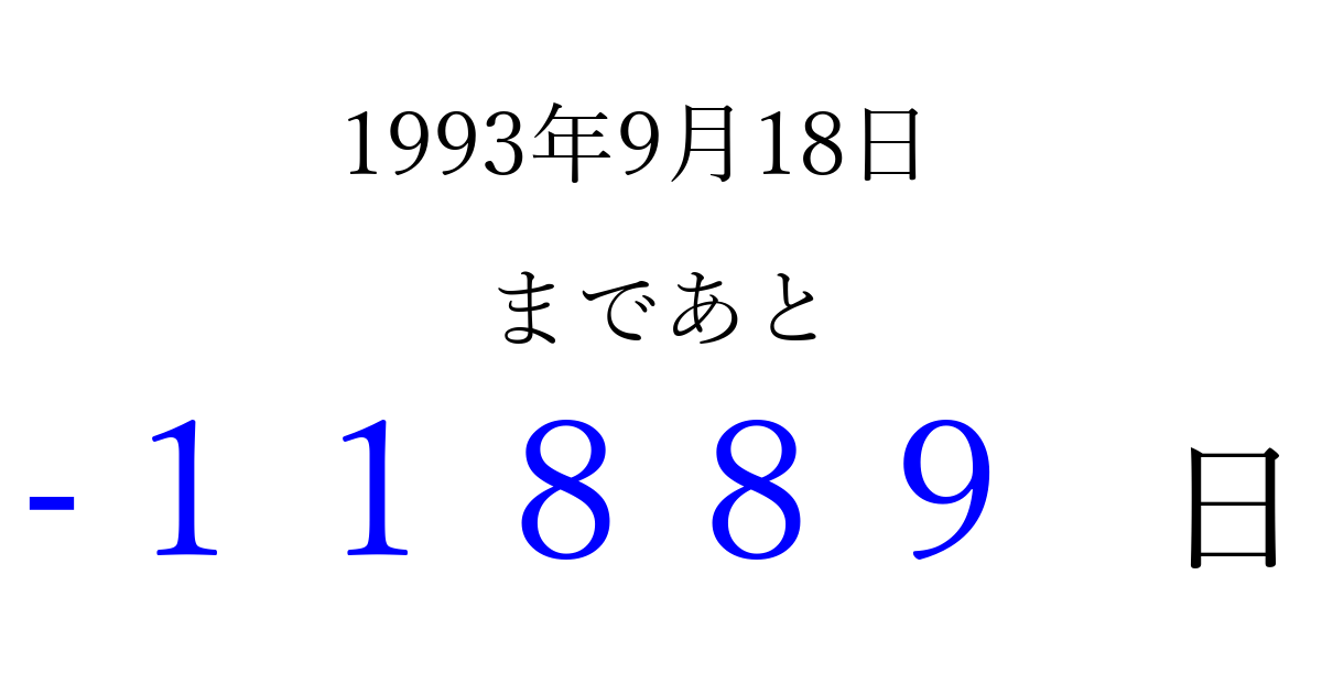 1993年9月18日(土)は もう 00000 日過ぎました 追加すると、トップページからすぐ選べるようになります ※2026/04/07現在の結果です。 最新の状態に更新する ↓シェアして、タイムライン上にカウントダウンを表示しよう!↓ 📤 この結果を共有する Tweet シェア Threads Bluesky 別の日付でカウントダウン 1993年9月のカレンダー このページをブックマークに追加すると、いつでもカウントダウンを確認できます。 (PC: Ctrl+D / Mac: ⌘+D) hitome-notes.comでは以下のページも運営しています。 指定日と期間から日付を計算 | ガチャ確率計算・シミュレーション | プライバシー・ポリシー 運営者:Avocado