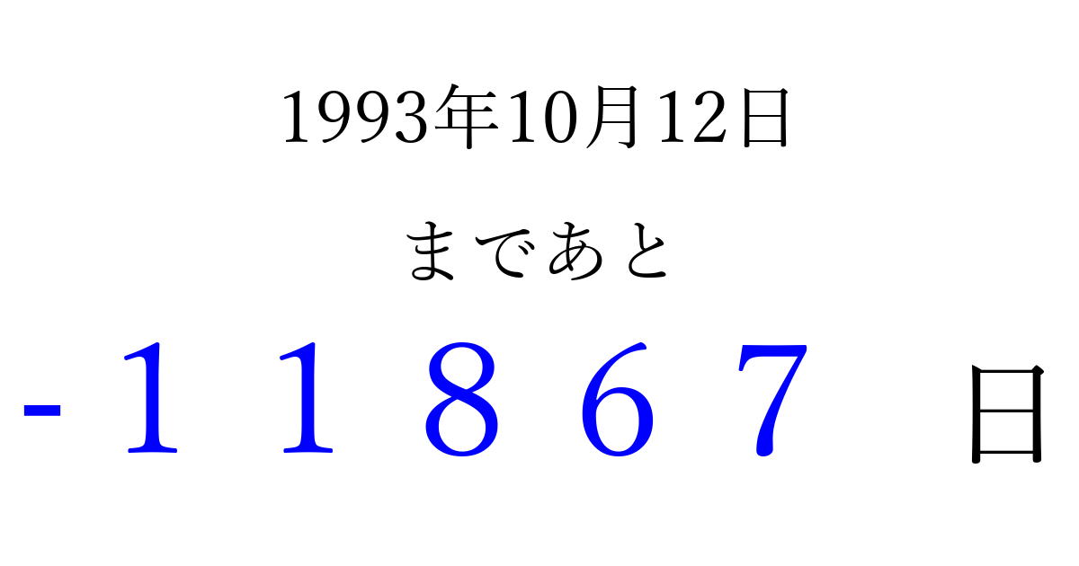 1993年10月12日(火)は もう 00000 日過ぎました 追加すると、トップページからすぐ選べるようになります ※2026/04/09現在の結果です。 最新の状態に更新する ↓シェアして、タイムライン上にカウントダウンを表示しよう!↓ 📤 この結果を共有する Tweet シェア Threads Bluesky 別の日付でカウントダウン 1993年10月のカレンダー このページをブックマークに追加すると、いつでもカウントダウンを確認できます。 (PC: Ctrl+D / Mac: ⌘+D) hitome-notes.comでは以下のページも運営しています。 指定日と期間から日付を計算 | ガチャ確率計算・シミュレーション | プライバシー・ポリシー 運営者:Avocado