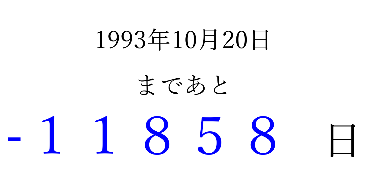 1993年10月20日(水)は もう 00000 日過ぎました 追加すると、トップページからすぐ選べるようになります ※2026/04/08現在の結果です。 最新の状態に更新する ↓シェアして、タイムライン上にカウントダウンを表示しよう!↓ 📤 この結果を共有する Tweet シェア Threads Bluesky 別の日付でカウントダウン 1993年10月のカレンダー このページをブックマークに追加すると、いつでもカウントダウンを確認できます。 (PC: Ctrl+D / Mac: ⌘+D) hitome-notes.comでは以下のページも運営しています。 指定日と期間から日付を計算 | ガチャ確率計算・シミュレーション | プライバシー・ポリシー 運営者:Avocado