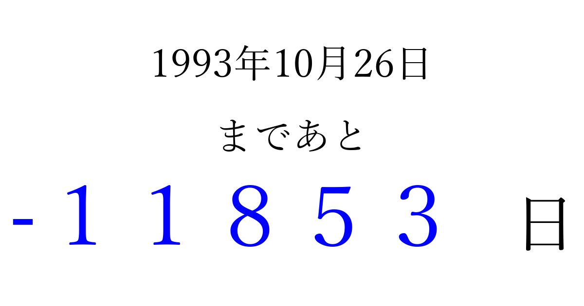1993年10月26日(火)は もう 00000 日過ぎました 追加すると、トップページからすぐ選べるようになります ※2026/04/09現在の結果です。 最新の状態に更新する ↓シェアして、タイムライン上にカウントダウンを表示しよう!↓ 📤 この結果を共有する Tweet シェア Threads Bluesky 別の日付でカウントダウン 1993年10月のカレンダー このページをブックマークに追加すると、いつでもカウントダウンを確認できます。 (PC: Ctrl+D / Mac: ⌘+D) hitome-notes.comでは以下のページも運営しています。 指定日と期間から日付を計算 | ガチャ確率計算・シミュレーション | プライバシー・ポリシー 運営者:Avocado