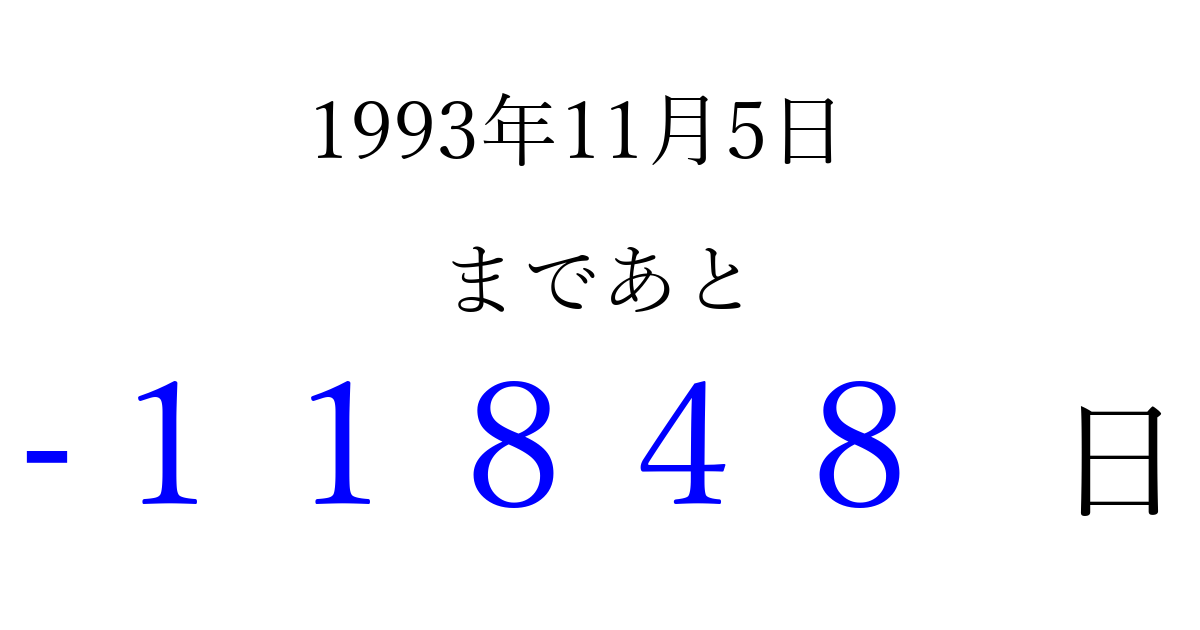 1993年11月5日(金)は もう 00000 日過ぎました 追加すると、トップページからすぐ選べるようになります ※2026/04/14現在の結果です。 最新の状態に更新する ↓シェアして、タイムライン上にカウントダウンを表示しよう!↓ 📤 この結果を共有する Tweet シェア Threads Bluesky 別の日付でカウントダウン 1993年11月のカレンダー このページをブックマークに追加すると、いつでもカウントダウンを確認できます。 (PC: Ctrl+D / Mac: ⌘+D) hitome-notes.comでは以下のページも運営しています。 指定日と期間から日付を計算 | ガチャ確率計算・シミュレーション | プライバシー・ポリシー 運営者:Avocado