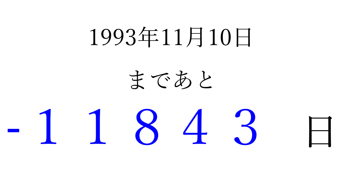 1993年11月10日(水)は もう 00000 日過ぎました 追加すると、トップページからすぐ選べるようになります ※2026/04/14現在の結果です。 最新の状態に更新する ↓シェアして、タイムライン上にカウントダウンを表示しよう!↓ 📤 この結果を共有する Tweet シェア Threads Bluesky 別の日付でカウントダウン 1993年11月のカレンダー このページをブックマークに追加すると、いつでもカウントダウンを確認できます。 (PC: Ctrl+D / Mac: ⌘+D) hitome-notes.comでは以下のページも運営しています。 指定日と期間から日付を計算 | ガチャ確率計算・シミュレーション | プライバシー・ポリシー 運営者:Avocado