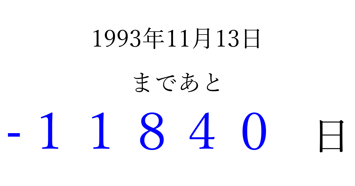 1993年11月13日(土)は もう 00000 日過ぎました 追加すると、トップページからすぐ選べるようになります ※2026/04/14現在の結果です。 最新の状態に更新する ↓シェアして、タイムライン上にカウントダウンを表示しよう!↓ 📤 この結果を共有する Tweet シェア Threads Bluesky 別の日付でカウントダウン 1993年11月のカレンダー このページをブックマークに追加すると、いつでもカウントダウンを確認できます。 (PC: Ctrl+D / Mac: ⌘+D) hitome-notes.comでは以下のページも運営しています。 指定日と期間から日付を計算 | ガチャ確率計算・シミュレーション | プライバシー・ポリシー 運営者:Avocado