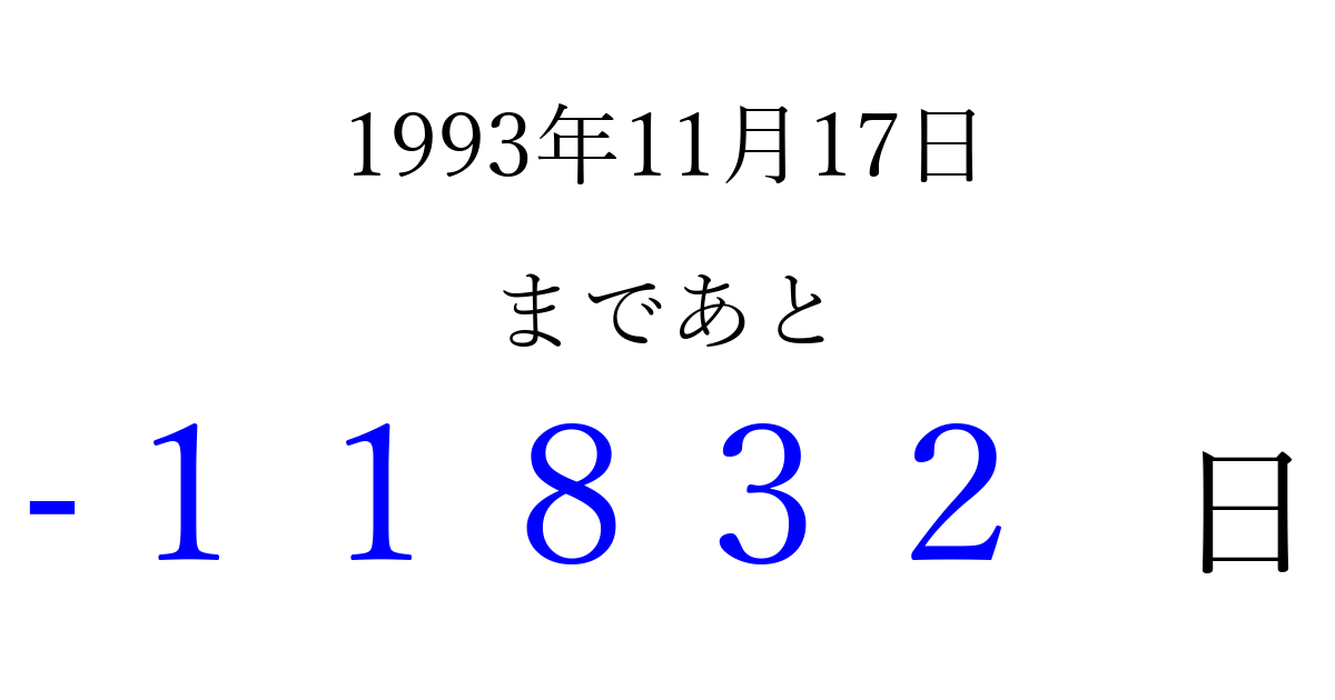 1993年11月17日(水)は もう 00000 日過ぎました 追加すると、トップページからすぐ選べるようになります ※2026/04/10現在の結果です。 最新の状態に更新する ↓シェアして、タイムライン上にカウントダウンを表示しよう!↓ 📤 この結果を共有する Tweet シェア Threads Bluesky 別の日付でカウントダウン 1993年11月のカレンダー このページをブックマークに追加すると、いつでもカウントダウンを確認できます。 (PC: Ctrl+D / Mac: ⌘+D) hitome-notes.comでは以下のページも運営しています。 指定日と期間から日付を計算 | ガチャ確率計算・シミュレーション | プライバシー・ポリシー 運営者:Avocado