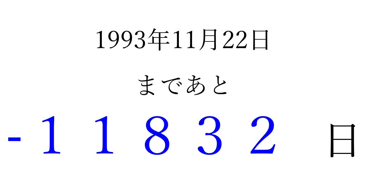 1993年11月22日(月)は もう 00000 日過ぎました 追加すると、トップページからすぐ選べるようになります ※2026/04/15現在の結果です。 最新の状態に更新する ↓シェアして、タイムライン上にカウントダウンを表示しよう!↓ 📤 この結果を共有する Tweet シェア Threads Bluesky 別の日付でカウントダウン 1993年11月のカレンダー このページをブックマークに追加すると、いつでもカウントダウンを確認できます。 (PC: Ctrl+D / Mac: ⌘+D) hitome-notes.comでは以下のページも運営しています。 指定日と期間から日付を計算 | ガチャ確率計算・シミュレーション | プライバシー・ポリシー 運営者:Avocado