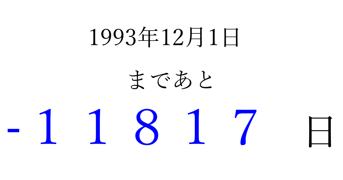 1993年12月1日(水)は もう 00000 日過ぎました 追加すると、トップページからすぐ選べるようになります ※2026/04/09現在の結果です。 最新の状態に更新する ↓シェアして、タイムライン上にカウントダウンを表示しよう!↓ 📤 この結果を共有する Tweet シェア Threads Bluesky 別の日付でカウントダウン 1993年12月のカレンダー このページをブックマークに追加すると、いつでもカウントダウンを確認できます。 (PC: Ctrl+D / Mac: ⌘+D) hitome-notes.comでは以下のページも運営しています。 指定日と期間から日付を計算 | ガチャ確率計算・シミュレーション | プライバシー・ポリシー 運営者:Avocado