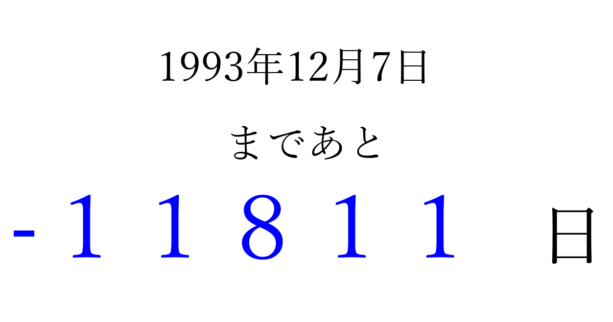 1993年12月7日(火)は もう 00000 日過ぎました 追加すると、トップページからすぐ選べるようになります ※2026/04/09現在の結果です。 最新の状態に更新する ↓シェアして、タイムライン上にカウントダウンを表示しよう!↓ 📤 この結果を共有する Tweet シェア Threads Bluesky 別の日付でカウントダウン 1993年12月のカレンダー このページをブックマークに追加すると、いつでもカウントダウンを確認できます。 (PC: Ctrl+D / Mac: ⌘+D) hitome-notes.comでは以下のページも運営しています。 指定日と期間から日付を計算 | ガチャ確率計算・シミュレーション | プライバシー・ポリシー 運営者:Avocado