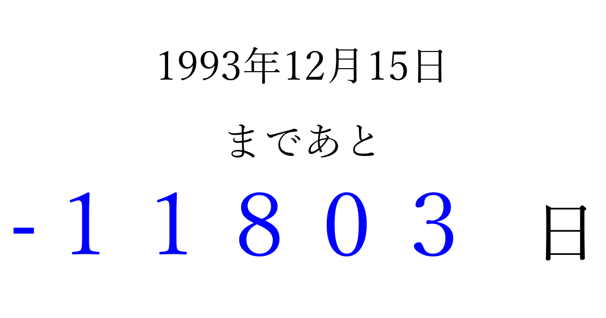 1993年12月15日(水)は もう 00000 日過ぎました 追加すると、トップページからすぐ選べるようになります ※2026/04/09現在の結果です。 最新の状態に更新する ↓シェアして、タイムライン上にカウントダウンを表示しよう!↓ 📤 この結果を共有する Tweet シェア Threads Bluesky 別の日付でカウントダウン 1993年12月のカレンダー このページをブックマークに追加すると、いつでもカウントダウンを確認できます。 (PC: Ctrl+D / Mac: ⌘+D) hitome-notes.comでは以下のページも運営しています。 指定日と期間から日付を計算 | ガチャ確率計算・シミュレーション | プライバシー・ポリシー 運営者:Avocado