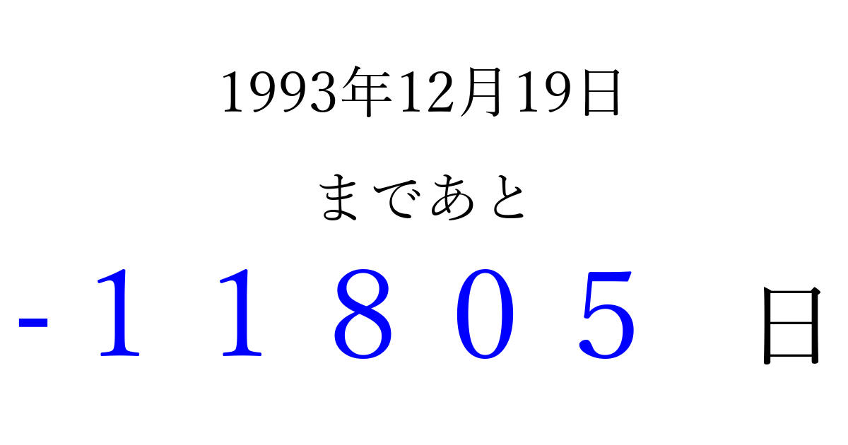 1993年12月19日(日)は もう 00000 日過ぎました 追加すると、トップページからすぐ選べるようになります ※2026/04/15現在の結果です。 最新の状態に更新する ↓シェアして、タイムライン上にカウントダウンを表示しよう!↓ 📤 この結果を共有する Tweet シェア Threads Bluesky 別の日付でカウントダウン 1993年12月のカレンダー このページをブックマークに追加すると、いつでもカウントダウンを確認できます。 (PC: Ctrl+D / Mac: ⌘+D) hitome-notes.comでは以下のページも運営しています。 指定日と期間から日付を計算 | ガチャ確率計算・シミュレーション | プライバシー・ポリシー 運営者:Avocado