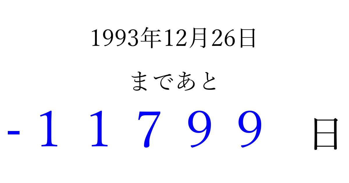 1993年12月26日(日)は もう 00000 日過ぎました 追加すると、トップページからすぐ選べるようになります ※2026/04/16現在の結果です。 最新の状態に更新する ↓シェアして、タイムライン上にカウントダウンを表示しよう!↓ 📤 この結果を共有する Tweet シェア Threads Bluesky 別の日付でカウントダウン 1993年12月のカレンダー このページをブックマークに追加すると、いつでもカウントダウンを確認できます。 (PC: Ctrl+D / Mac: ⌘+D) hitome-notes.comでは以下のページも運営しています。 指定日と期間から日付を計算 | ガチャ確率計算・シミュレーション | プライバシー・ポリシー 運営者:Avocado