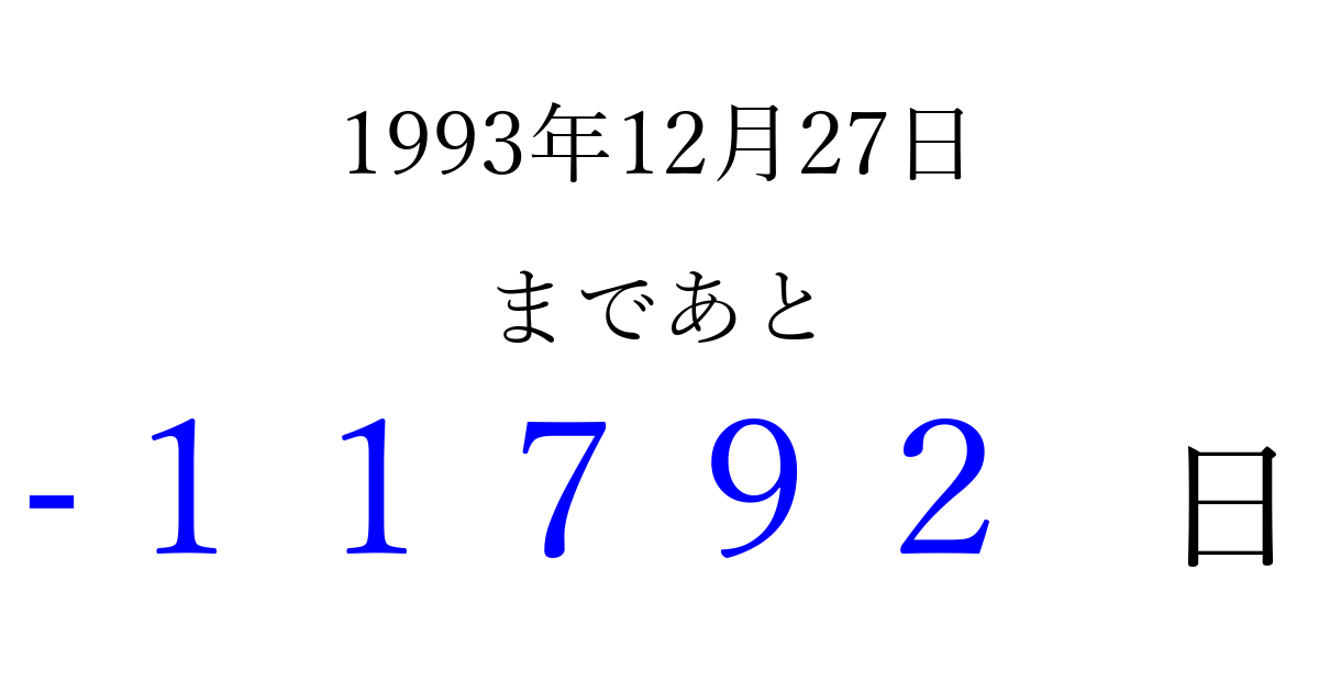 1993年12月27日(月)は もう 00000 日過ぎました 追加すると、トップページからすぐ選べるようになります ※2026/04/10現在の結果です。 最新の状態に更新する ↓シェアして、タイムライン上にカウントダウンを表示しよう!↓ 📤 この結果を共有する Tweet シェア Threads Bluesky 別の日付でカウントダウン 1993年12月のカレンダー このページをブックマークに追加すると、いつでもカウントダウンを確認できます。 (PC: Ctrl+D / Mac: ⌘+D) hitome-notes.comでは以下のページも運営しています。 指定日と期間から日付を計算 | ガチャ確率計算・シミュレーション | プライバシー・ポリシー 運営者:Avocado