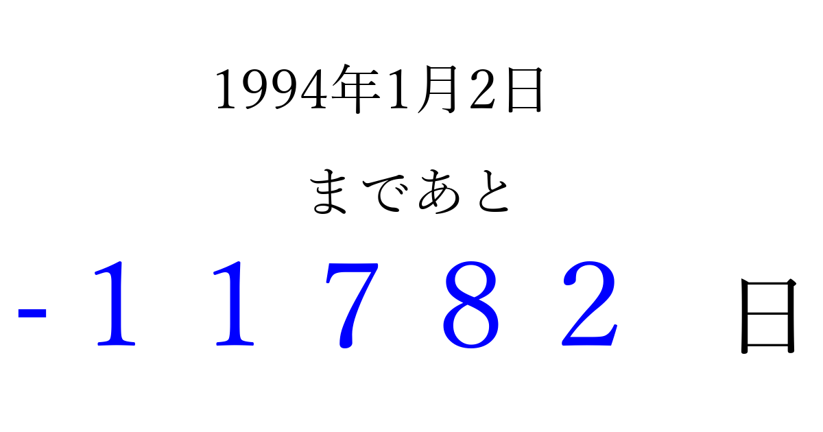 1994年1月2日(日)は もう 00000 日過ぎました 追加すると、トップページからすぐ選べるようになります ※2026/04/06現在の結果です。 最新の状態に更新する ↓シェアして、タイムライン上にカウントダウンを表示しよう!↓ 📤 この結果を共有する Tweet シェア Threads Bluesky 別の日付でカウントダウン 1994年1月のカレンダー このページをブックマークに追加すると、いつでもカウントダウンを確認できます。 (PC: Ctrl+D / Mac: ⌘+D) hitome-notes.comでは以下のページも運営しています。 指定日と期間から日付を計算 | ガチャ確率計算・シミュレーション | プライバシー・ポリシー 運営者:Avocado
