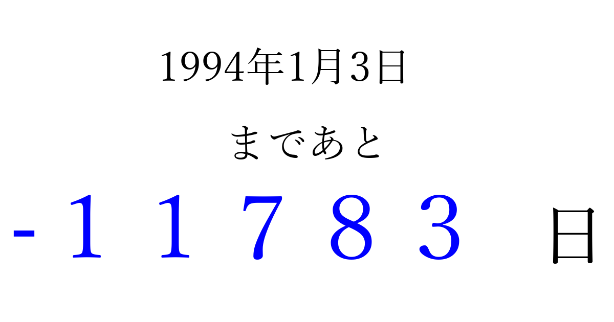 1994年1月3日(月)は もう 00000 日過ぎました 追加すると、トップページからすぐ選べるようになります ※2026/04/08現在の結果です。 最新の状態に更新する ↓シェアして、タイムライン上にカウントダウンを表示しよう!↓ 📤 この結果を共有する Tweet シェア Threads Bluesky 別の日付でカウントダウン 1994年1月のカレンダー このページをブックマークに追加すると、いつでもカウントダウンを確認できます。 (PC: Ctrl+D / Mac: ⌘+D) hitome-notes.comでは以下のページも運営しています。 指定日と期間から日付を計算 | ガチャ確率計算・シミュレーション | プライバシー・ポリシー 運営者:Avocado