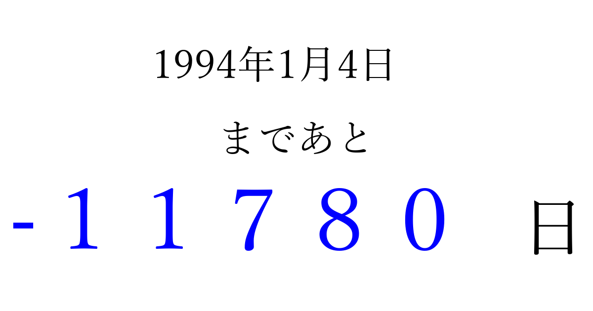 1994年1月4日(火)は もう 00000 日過ぎました 追加すると、トップページからすぐ選べるようになります ※2026/04/06現在の結果です。 最新の状態に更新する ↓シェアして、タイムライン上にカウントダウンを表示しよう!↓ 📤 この結果を共有する Tweet シェア Threads Bluesky 別の日付でカウントダウン 1994年1月のカレンダー このページをブックマークに追加すると、いつでもカウントダウンを確認できます。 (PC: Ctrl+D / Mac: ⌘+D) hitome-notes.comでは以下のページも運営しています。 指定日と期間から日付を計算 | ガチャ確率計算・シミュレーション | プライバシー・ポリシー 運営者:Avocado