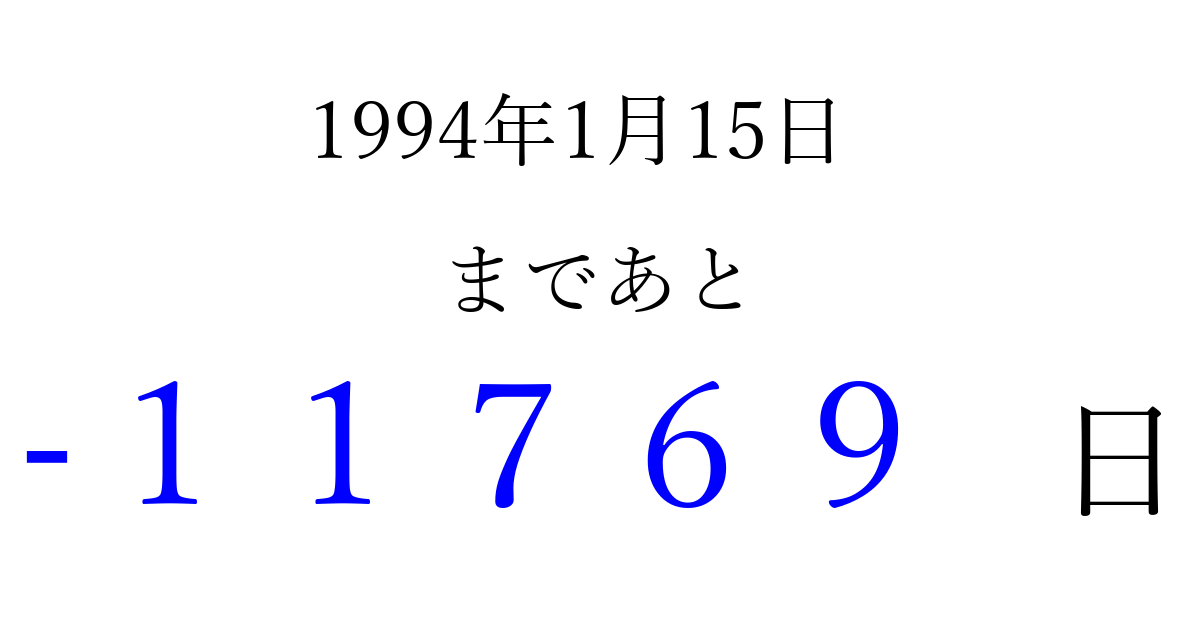 1994年1月15日(土)は もう 00000 日過ぎました 追加すると、トップページからすぐ選べるようになります ※2026/04/06現在の結果です。 最新の状態に更新する ↓シェアして、タイムライン上にカウントダウンを表示しよう!↓ 📤 この結果を共有する Tweet シェア Threads Bluesky 別の日付でカウントダウン 1994年1月のカレンダー このページをブックマークに追加すると、いつでもカウントダウンを確認できます。 (PC: Ctrl+D / Mac: ⌘+D) hitome-notes.comでは以下のページも運営しています。 指定日と期間から日付を計算 | ガチャ確率計算・シミュレーション | プライバシー・ポリシー 運営者:Avocado